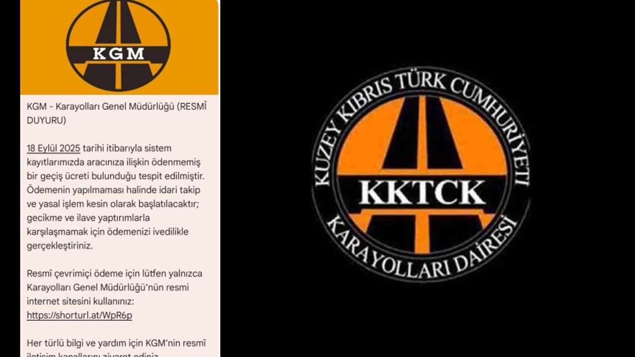 Bayındırlık ve Ulaştırma Bakanlığı, T.C. Karayolları Genel Müdürlüğü (KGM) adına "Resmi Duyuru" ifadesiyle KKTC’de bulunan Türkiye Cumhuriyeti vatandaşlarına gönderilen ve “ödenmemiş geçiş ücreti” bulunduğu belirtilen SMS’lerin sahte ve dolandırıcılık amaçlı olduğunu duyurdu.
