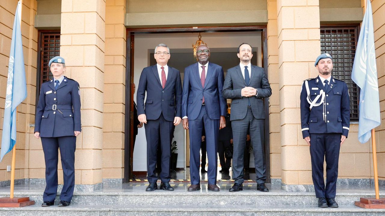 İki lider ve BM Genel Sekreteri’nin Kıbrıs Özel Temsilcisi ve UNFICYP Misyon Şefi Khassim Diagne, girişte birlikte görüntü verdi.