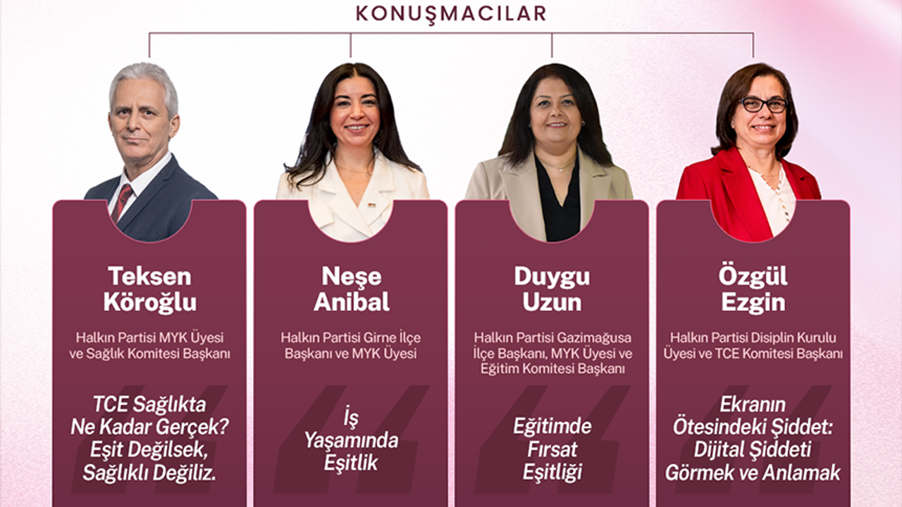 “HP Merkez Yürütme Kurulu (MYK) Üyesi ve Sağlık Komitesi Başkanı Teksen Köroğlu, ‘Toplumsal Cinsiyet Eşitliği Sağlıkta Ne Kadar Gerçek? Eşit Değilsek Sağlıklı Değiliz’; HP Girne İlçe Başkanı ve MYK Üyesi Neşe Anibal ‘İş Yaşamında Eşitlik’; HP Gazimağusa İlçe Başkanı ve MYK Üyesi Eğitim Komitesi Başkanı Duygu Uzun ‘Eğitimde Fırsat Eşitliği’; HP Disiplin Kurulu Üyesi ve Toplumsal Cinsiyet Eşitliği Komitesi Başkanı Özgül Ezgin de ‘Ekranın Ötesindeki Şiddet: Dijital Şiddeti Görmek ve Anlamak.’ ”