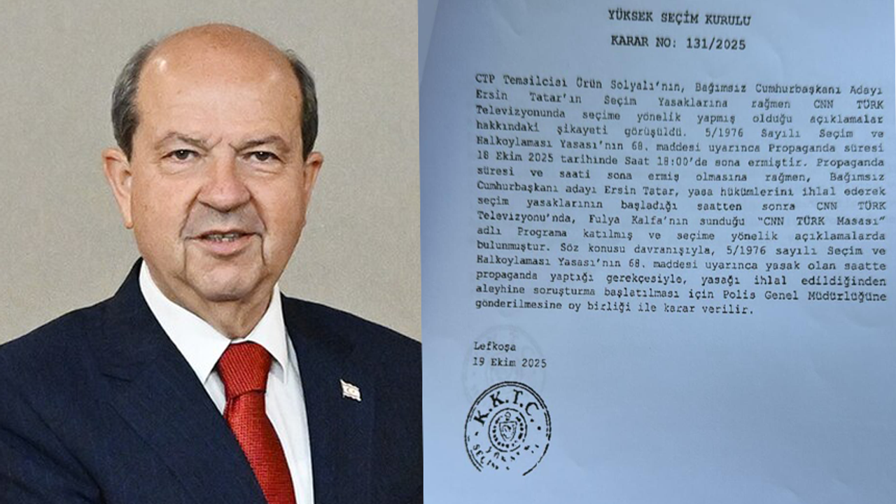 Yüksek Seçim Kurulu (YSK), Cumhuriyetçi Türk Partisi (CTP) Temsilcisi Ürün Solyalı’nın, bağımsız Cumhurbaşkanı adayı Ersin Tatar’ın seçim yasaklarına rağmen CNN Türk televizyonunda seçime yönelik açıklamalarda bulunduğu yönündeki şikayetini değerlendirdi. Kaynak: YSK: Ersin Tatar seçim yasaklarını ihlal etti, polis soruşturması başlatılsın!